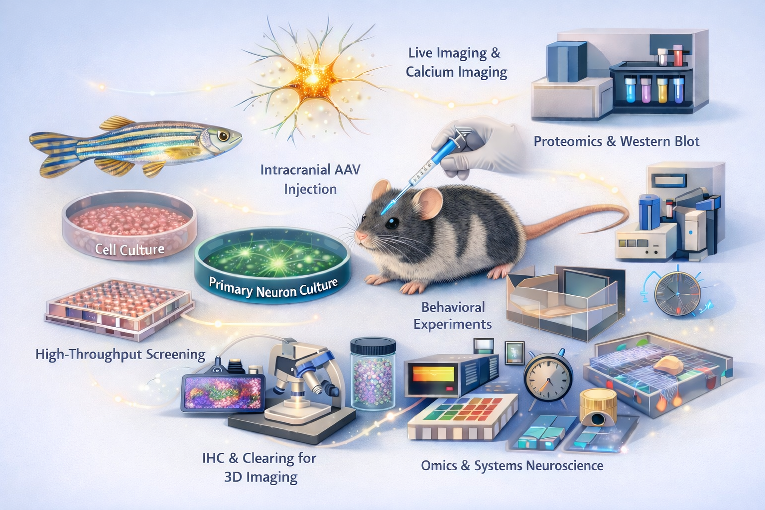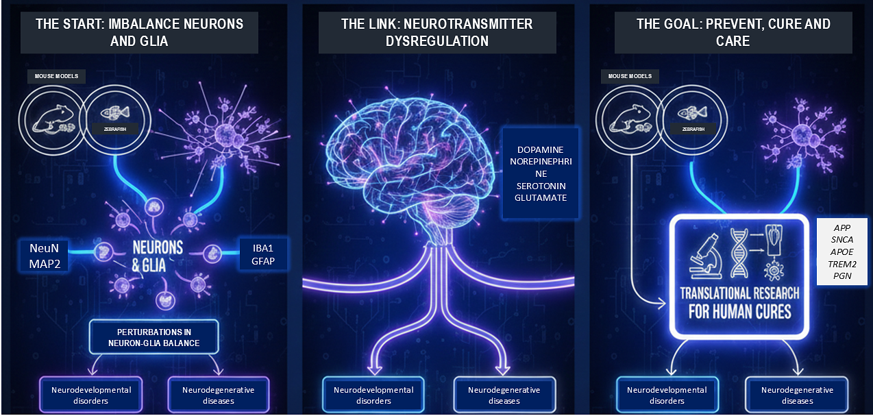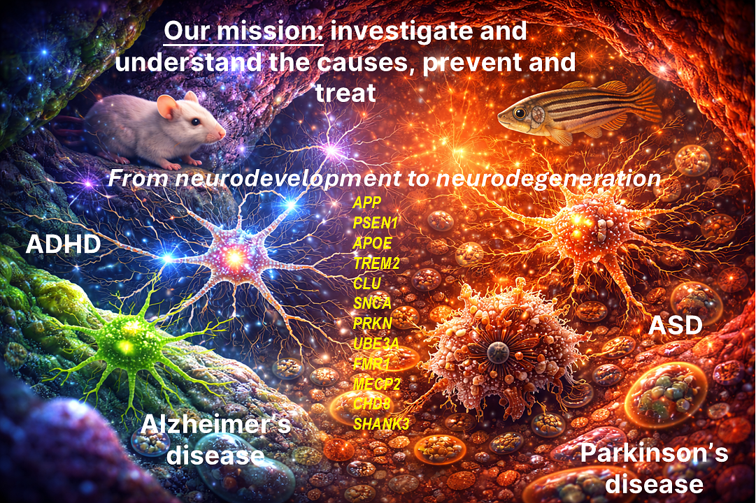 Neurodevelopmental risk genes for autism and ADHD (e.g., UBE3A, FMR1, SHANK3, CNTNAP2, SCN2A, DRD4/DAT1 pathways) are essential for wiring synapses and stabilizing excitation–inhibition balance, yet their disruption can also prime long-term circuit fragility and stress sensitivity. Investigating the cross-talk between neurons and glia is important to uncover how synaptic dysfunction, cilia signaling, and neurotransmitter imbalance evolve from early-life genetic risk into lifelong vulnerability. By integrating zebrafish, mouse, and cell models, we will identify convergent mechanisms shared across neurodevelopment and Alzheimer’s-related pathology, opening routes for cross-disorder therapeutics, and translation to human.